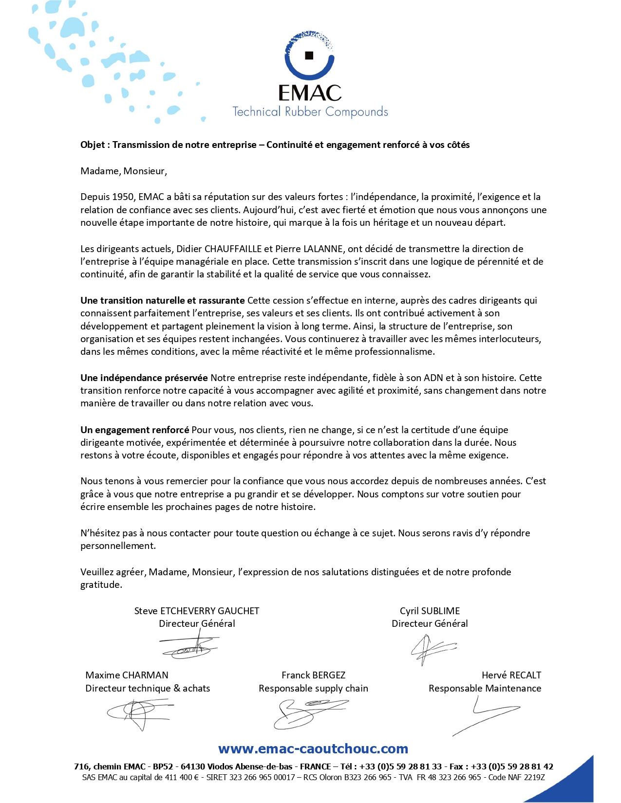 Nous avons le plaisir de vous annoncer une nouvelle étape importante dans l’histoire d’EMAC : une transmission en interne aux cadres.